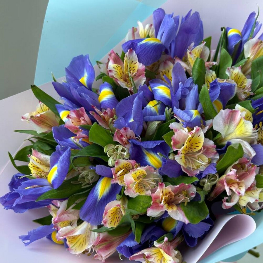На фото букет «синие дали». В составе: ирис 15 шт, альстромерия 10 шт, дизайнерская упаковка 1 шт, атласная лента 1 шт, . Все цветы свежие и ароматные, букет красиво оформлен и отлично подходит для подарка. Доступна доставка цветов или самовывоз.